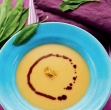 Juho zmešamo s paličnim mešalnikom in po okusu začinimo. Nalijemo jo v krožnike, okrasimo z regratovimi cvetnimi lističi in bučnim oljem ter postrežemo.