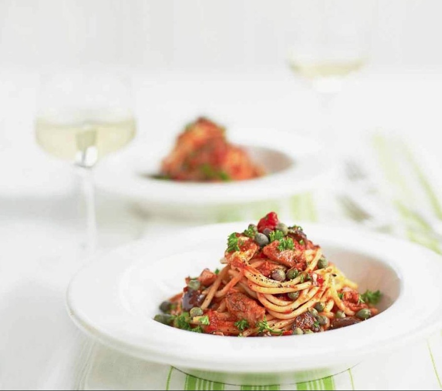 V veliki količini vrele osoljene vode po navodilih iz embalaže skuhamo špagete. Medtem pripravimo omako tako, da v srednje veliki ponvi segrejemo olje in na njem kakšno minuto pražimo strta stroka česna. Dodamo čili, pelate in sardine. Segrevamo 2 do 3 minute, vmes sardine s kuhalnico zdrobimo na manjše dele. Nato vmešamo še grobo narezane olive, odcejene kapre in skoraj ves peteršilj. Vse sestavine med seboj dobro premešamo.