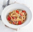 400 g špagetov 1 žlica oljčnega olja 2 stroka česna ščep posušenega čilija 220 g sesekljanega paradižnika iz pločevinke (pelatov) 200 g sardin s paradižnikovo omako iz pločevinke 100 g črnih oliv brez koščic 1 žlica kaper manjša pest sesekljanega peteršilja