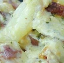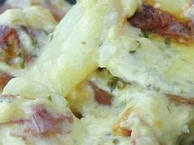 50 dag šampinjonov, 50 dag krompirja, 10 dag mladega sira, 2 dl mleka, dl smetane, 2 jajci, pol šopka peteršilja, strok česna, muškatov orešek, 2 dag masla, sol, poper.