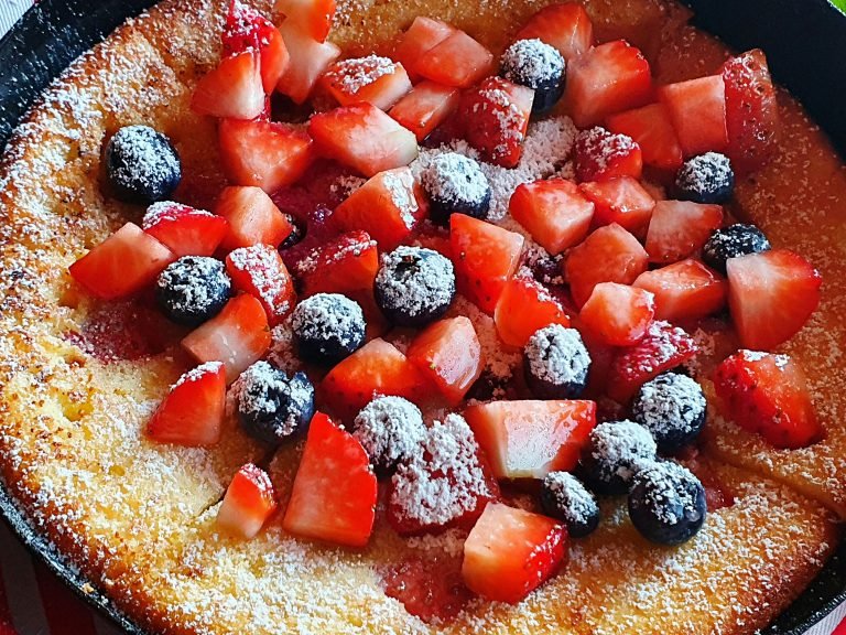 3 jajca, 5 – 6 jušnih žlic moke (odvisno od velikosti jajc – masa ne sme biti preveč gosta, malo manj kot za palačinke), 3 jušne žlice sladkorja, 2 dl mleka, maslo, kremno maslo, naribana lupinica in sok 1 bio limone, sladkor v prahu, 125 g borovnic, 250 g jagod.