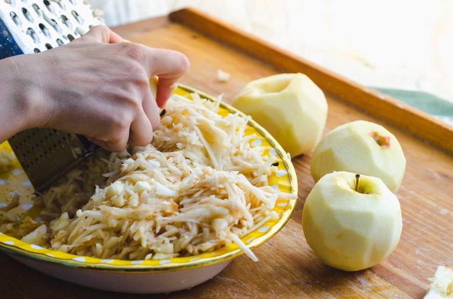 Jabolka olupimo in jih s strgalnikom grobo naribamo. Dodamo sladkor in mleti cimet ter vse skupaj dobro premešamo.