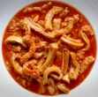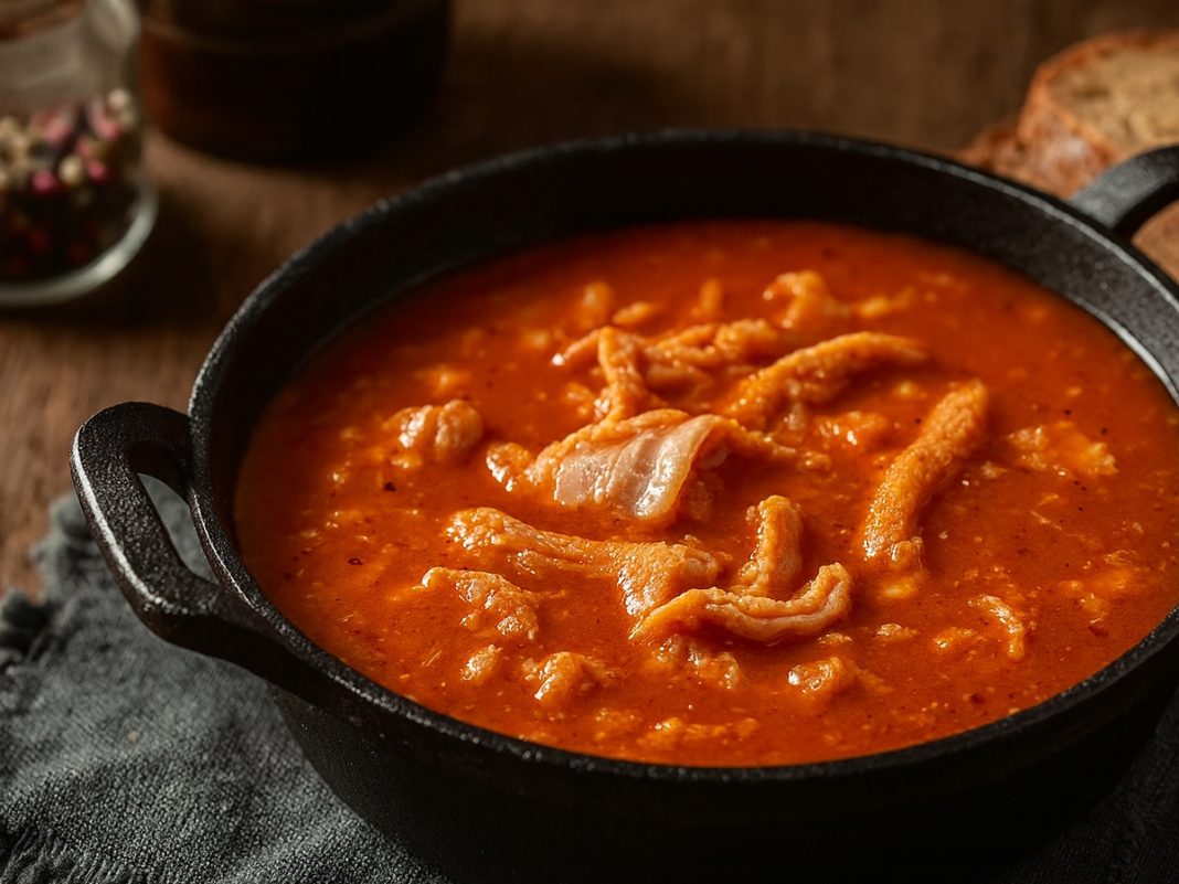 Na olju prepražite drobno narezano slanino, čebulo in drobtine. Še preden zarumenijo, dodajte paradižnikovo mezgo in narezane vampe (na tanke rezance).