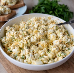 Sveža in kremasta jajčna solata s skuto - brez dodatka težke majoneze ali jogurta. Odlična za sendviče, zavitke ali pa zgolj kot beljakovinsko bogata priloga.