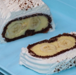 Nadev namažemo na ohlajen biskvit. Banane, namočene v limonin sok, enakomerno razporedimo na rob biskvita.