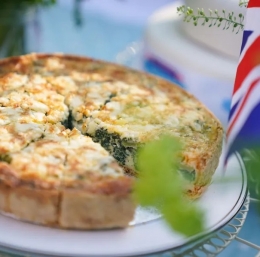 125 ml mleka 175 ml sladke smetane za kuhanje 2 srednje veliki jajci 1 jedilna žlica sesekljanega svežega pehtrana sol in poper 100 g naribanega sira cheddar 180 g kuhane in rahlo sesekljane špinače 60 g kuhanega boba ali sojinih zrn