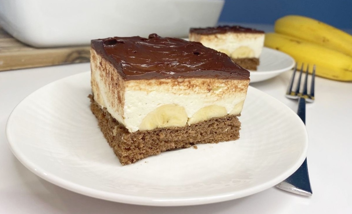 Izvrstna sladica za vse, ki se navdušujete nad kombinacijo banan in čokolade. Pod čokoladnim prelivom se skriva slastna skutina krema z bananami. Osnova pa je rahlo biskvitno testo s kakavom, ki ga lahko pripravite tudi z ajdovo moko.