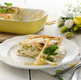 Zeleno-belo špargljevo lazanjo pečemo v predhodno ogreti pečici na 200 °C ca. 20-30 minut.