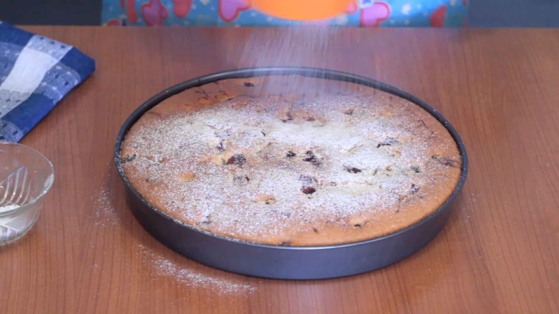 5 jajc 300 g sladkorja 300 g moke 200 ml olja 200 ml jogurta 10 g pecilnega praška 500 g očiščenih višenj sladkor v prahu za posip (po želji)