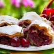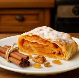 Postrezite še tople kose štrudlja, po želji posujte s sladkorjem v prahu. Hrustljavo testo in nežno sladek nadev vas bosta spomnila na okuse babičine kuhinje.