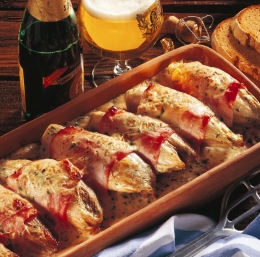 Pečeno cikorijo prerežemo na pol in eno polovico napolnimo z mesno omako (del prihranimo), pokrijemo z drugo polovico in vse skupaj zavijemo v rezino kuhane šunke. Ostanek mesne omake zlijemo v pekač, naložimo vanj še ovito cikorijo in prelijemo s sirom, ki smo ga zmešali z rumenjakom.