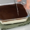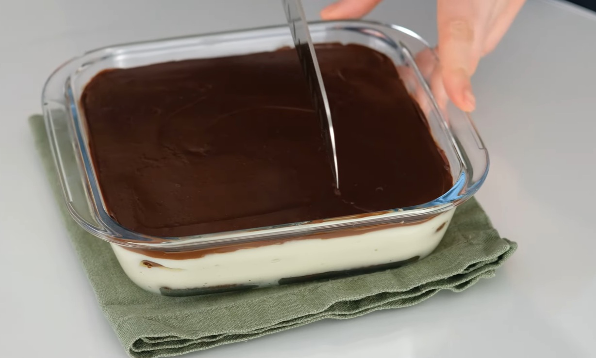 Dodajte drugo plast piškotov in prelijte preostalo kremo. Poravnajte površino.