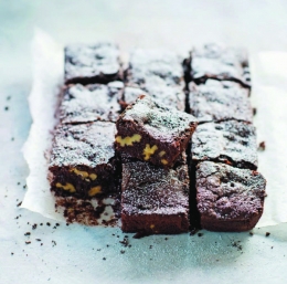 Testo vlijemo v pekač in pečemo pol ure na 180 stopinjah. Počakamo, da se ohladi, nato ga narežemo na kocke in potresemo s sladkorjem v prahu.