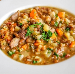 Leča je ena tistih stročnic, ki ponuja ogromno hranil, hkrati pa jo telo hitro prebavi. V kombinaciji z korenjem, krompirjem, čebulo in mesom dobimo popolno enolončnico, ki bo nasitila še tako lačne želodce. V skledi se srečata rustikalni okus stročnic in nežna sladkoba zelenjave, meso pa doda globino in sočnost.