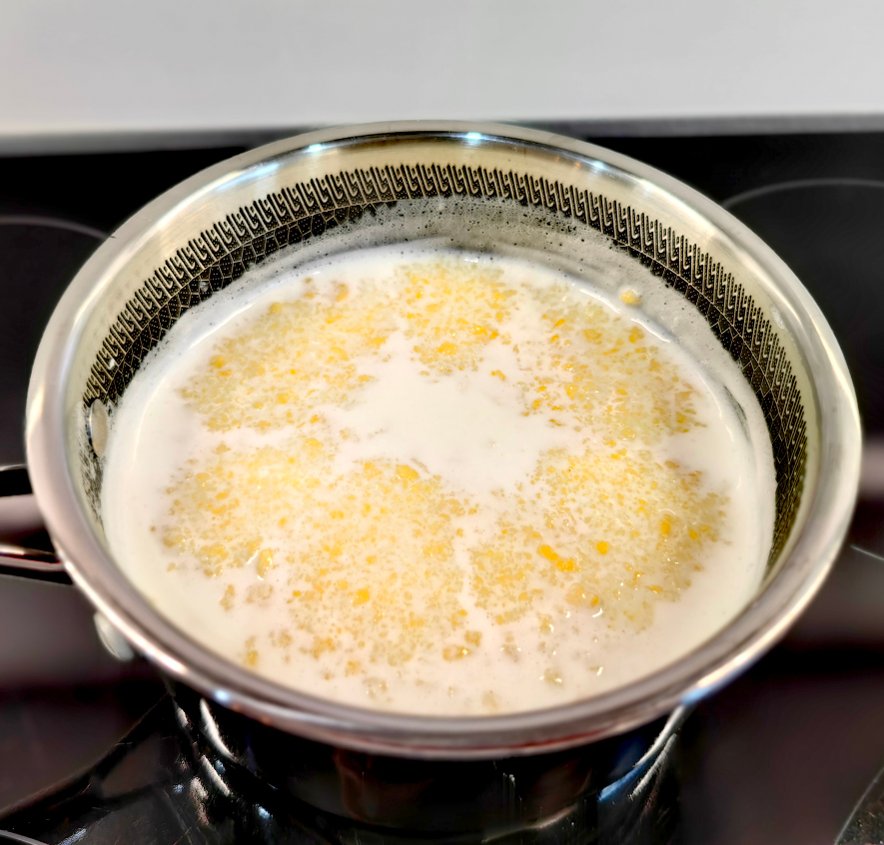 Zmanjšamo na nizko temperaturo, da se kuha počasi in se nam mleko ne prismodi. Kuhamo približno 10 do 15 minut in vmes večkrat premešamo, saj se mleko hitro prime dna posode. Jed mora biti malo bolj redka, ker ko se malce ohladi, se bo še zgostila.