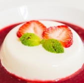 Špargljeva panakota z biskvitnimi kockami in svežimi jagodami