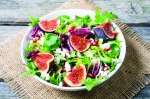 4 fige, 300 svežih listov različnih solat (rukola, špinača, radič, zelena solata), 50 g belega sira, oljčno olje, žlica limoninega soka, žlička gorčice v zrnju, sol, poper.