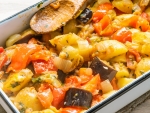 Potresemo s papriko, koščki jajčevca in čebulo, spet malo popečemo in nazadnje vmešamo še narezan paradižnik in razkosano tunino iz pločevinke (olje seveda odlijemo).