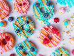– 500 g listnatega testa – 100 g kremnega sira – 120 g sladkorja v prahu – 0,3 dl stopljenega masla – 0,2 dl mleka – jedilna barva (rdeča, modra) – maline, borovnice – pisane sladkorne mrvice – olje za cvrtje