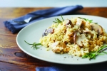 400 g šampinjonov, 300 g riža, 60 g masla, 3 žlice oljčnega olja, 1 čebula, 1 strok česna, sol, poper, 50 g trdega sira za ribanje, 500 ml svetlega pšničnega piva, 500 ml zelenjavne jušne osnove, nekaj vejic rožmarina