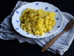 2. V slani vodi skuhajte testenine, odcedite. Drobno nasekljajte čebulo in jo prepražite v široki ponvi, da rahlo porumeni. Z oljem kar radodarno.