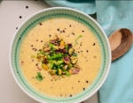 1 čebula 2 stroka česna 1 večji krompir 300 g kuhane koruze 7 dcl zelenjavne jušne osnove 5-6 zvrhane žlice mletih mandljev (priporočamo olupljene) 2 žlici kvasnih kosmičev 2-4 žlice repičnega olja muškatni orešček (priporočamo sveže mletega) ščep čilijevih kosmičevk sol in poper po okusu popražen por in pistacije za okras