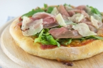 Pečeno pizzo obložimo z rukolo, rezinami pršuta in parmezana. Solimo in pokapljamo z olivnim olje.