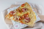 Naoljen pekač obložimo s testom. Na testo damo koščke paradižnika, obložimo z mocarelo in suho salamo. Pokapamo z oljem.
