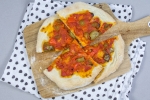 Testo obložimo s omako iz paprike, dodamo se narezane olive in pečemo 20 min na 230° C.