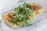 Po pečeni pizzi razporedimo rukolo, potresemo nariban parmezan in pokapljamo z olivnim oljem, ki smo mu dodali strt česen.