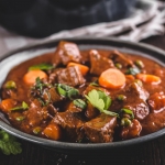 4 žlic olja 500 g govejega bočnika 1 velika čebula 1 manjši por 450 g korenčka 1 peteršiljeva korenina z zelenjem 1 lovorjev list 2 žlici paradižnikovega koncentrata 300 ml rdečega vina 600 ml mesne jušne osnove 0.75 žličke soli 0.25 žličke mletega popra