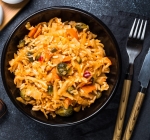 Na močnejšem ognju meso dobro prepražimo, sproti ga pridno mešamo. Dodamo *korenasto zelenjavo, ki smo jo narezali na enakomerne kockice (približno 1 x 1 cm), premešamo in kratko pražimo. Solimo in popramo ter malo podlijemo z vodo. Pustimo kuhati približno 15 minut.