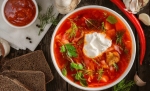 50 g maščobe 200 g korenja 200 g peteršiljeve korenine 200 g zelene 100 g krompirja 1 čebula 200 g svežega zelja 150 g rdeče pese 1 žlica paradižnikove mezge žlička moke jušna osnova 60 g šunke sol poper kis ali vino 3 žlice kisle smetane peteršilj, koper
