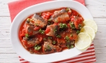 500 g svežih in očiščenih sardel 1 majhna čebula 2 stroka česna 2 konzervi olupljenih paradižnikov 1 dl suhega belega vina 1 šopek svežega peteršilja 4 žlice oljčnega olja sol in poper