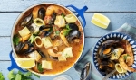4 Dodamo ribo, školjke in kozice. Lonec pokrijemo in pustimo juho vreti še 10 minut, da se školjke odprejo. Školjke, ki se ne odprejo, zavržemo. Juho nalijemo v skodelice ali krožnike in takoj ponudimo.