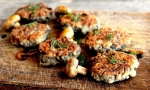 4 Peteršilj drobno sesekljamo in ga skupaj z mletimi lešniki in naribanim parmezanom dodamo k masi. Dodamo rumenjak in drobtine ter maso dobro premešamo.