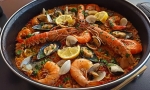 7 Zadnjih 5 minut na vrh dodamo školjke, popečene kozice in škampe in potresemo s svežim, nasekljanim peteršiljem. Ogenj povečamo in paello pustimo , da se riž od spodaj zapeče in izpari vsa voda. Preden postrežemo, pustimo počivati 5 do 10 minut, okrasimo z limono in postrežemo v ponvi.