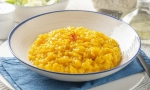2 Na srednji temperaturi počasi prilivamo vino in 1/3 telečje osnove. Pustimo, da vre 5 minut. Prilijemo 2/3 osnove in riž kuhamo 12 minut. Občasno premešamo. Medtem namočimo žafran v preostalo osnovo. Ko riž vpije vso tekočino, prilijemo obarvano osnovo z žafranom. Posolimo in popopramo. Vse skupaj kuhamo še 20 minut in občasno premešamo.