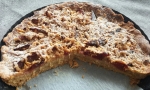 5 Vse sestavine za nadev dobro zmešamo. V ohlajeno testo najprej zlijemo nadev, potem pa nanj previdno položimo razpolovljene slive (mi smo jih narezali na ožje krhlje). Iz zamrzovalnika vzamemo malo kepico testa in jo naribamo prek sliv.