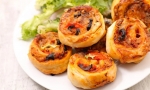 Pečico segrejemo na 200°C. Vzhajano testo razvaljamo na tanek pravokotnik. Nanj najprej namažemo paradižnikovo omako, razporedimo šunko, potresemo s sirom in oljkami in dodamo še češnjeve paradižnike. Testo zavijemo v kompakten zvitek in dobro zatisnemo robove.