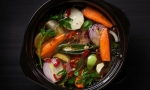 3 Posodo odstavimo, da se juha nekoliko ohladi. Ohlajeno juho precedimo čez drobno cedilo. S pomočjo hrbta zajemalke iz zelenjave iztisnemo ves sok. Lahko si pomagamo tudi s čisto gazo, ki jo nazadnje previdno ožamemo. Precejeno jušno osnovo lahko zamrznemo ali uporabimo za pripravo različnih jedi.