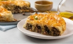 2 Pekač za pite naoljimo. Dno in stranice obložimo s testom (2 plasti). Dodamo malo nadeva in pokrijemo z drugim testom. Ponavljamo, dokler na zmanjka sestavin. Na koncu zaključimo z dvemi plastmi testa. Robove zavijemo navznoter.