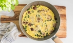 3 Preden boste omleto obrnili, jo potisnite malo k robu ponve, da preostala tekoča jajčna masa steče k robu in zakrkne. Ko obračate omleto, mora po vrhu imeti čim manj ali nič tekoče jajčne mase.