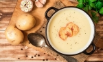8 strokov česna 1 por 4 krompirji 4 žlice olja 1,5 l jušne osnove ali vrele vode kumina 1 jajce 1,5 dl sladke smetane peteršilj