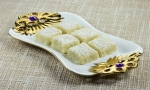S polovico mase namažemo piškotno dno, posujemo mandljeve lističe in premažemo s preostankom mase. Pekač za najmanj 2 uri postavimo v hladilnik, da se učvrsti. Preden postrežemo, posujemo s kokosovo moko in postrežemo. Mandljeve lističe lahko posujemo tudi le po vrhu, kakor nam je ljubše.