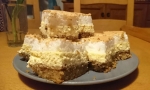 Medtem pripravimo nadev in sicer tako, da vse sestavine dobro premešamo med sabo. Porazdelimo ga po pečenem testu in ponovno postavimo v pečico za 15-20 minut, dokler ni nadev pečen. Iz beljakov in sladkorja stepemo trd sneg. Porazdelimo ga na pečen nadev in postavimo v pečico še za dobrih 10 minut, da se zlato rjavo obarva.