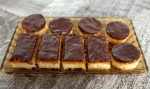 Pečen biskvit ohladite. Prerežite ga na pol. Spodnjo polovico biskvita vrnite v pekač. Premažite ga z marmelado. Če je marmelada pretrda za mazanje, jo segrejte v vodni kopeli ali v mikrovalovni pečici.