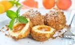 1 kg krompirja 250 g ostre moke 1 jajce 20 g masla žička soli 20 marelic (lahko zmrznjenih) 10 g masla 100 g drobtinic 1 žlička cimeta sladkor