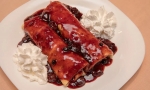Na krožnik postavimo palačinko, polovico namažemo z mascarponejevo kremo, zavijemo v rolico in prelijemo z višnjami. Zraven ponudimo stepeno sladko smetano.
