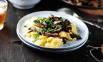 Na krožnike razporedimo kuhano polento, na vrh damo omako iz gob in potresemo z nasekljanim svežim peteršiljem.